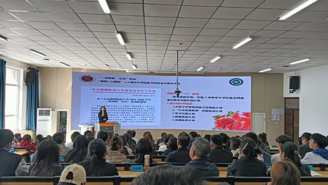 为深入贯彻落实《关于在学生中开展“‘新师・石榴情’1+5铸牢中华民族共同体意识教育实践行动计划”的通知》及“三进两联一交友”相关工作要求,健全学校铸牢中华民族共同体意识教育实践常态化机制,深化三全育人格局,促进各族师生交往交流交融,切实做好学生关心关爱与思想引领工作,生命科学学院于9月28日在笃学楼118、120教室同步开展“三进两联一交友‘石榴愿圆’”师生见面会。新疆师范大学党委副书记、校长艾尼娃尔・艾克木,学校各机关教辅部门、学院全体教职工及学生参与此次见面会,会议由生命科学学院辅导员苏日耶姆·尼加提、李梦圆主持。